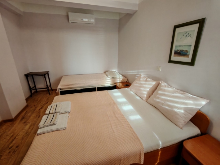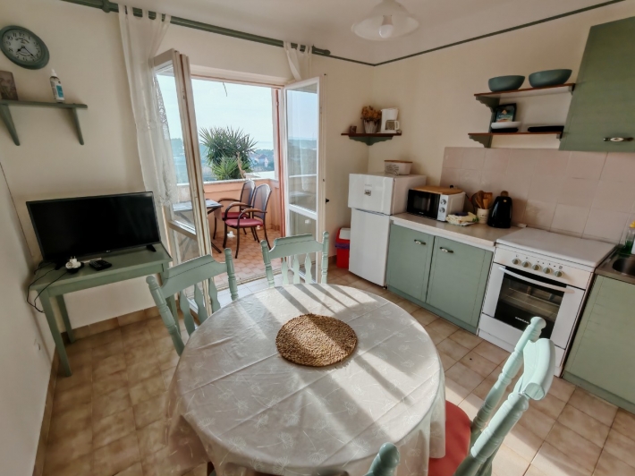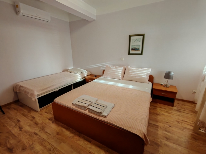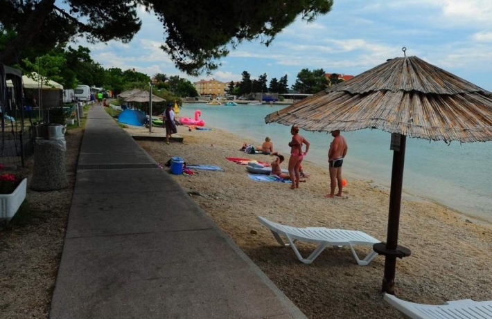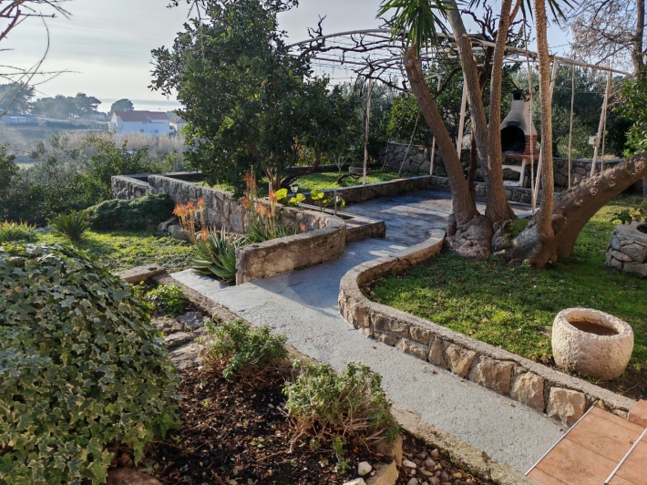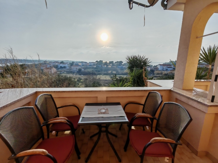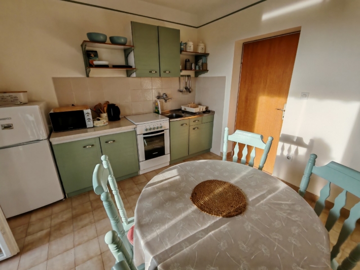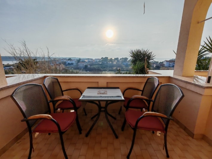 Description German: Diese Apartment für 4 bis 5 Personen befindet sich im Ort Banjol auf der Insel Rab. Die 50 qm grosse Unterkunft auf der 1.Etage des Hauses teilt sich in zwei Schlafzimmer, ein Badezimmmer so wie einer Küche mit Essbereich auf. Der überdachte Balkon mit Meerblick lädt zum Verweilen ein. Eine gemeinsame Terasse mit Grill befindet sich vor dem Haus im Garten. Der Badestrand im Autocamp PADOVA III ist nur 600m entfernt.