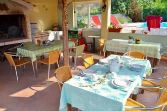 Gemeinsame überdachte Hoffterasse mit Grill beim Swimmingpool. In der Ferienwohnung sind 2 Klimaanlagen.