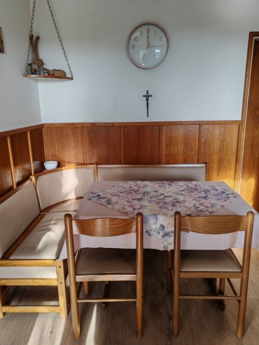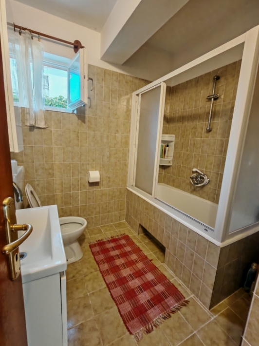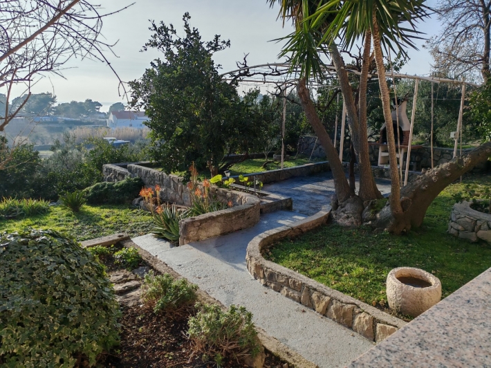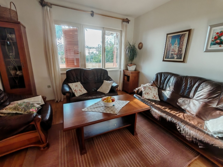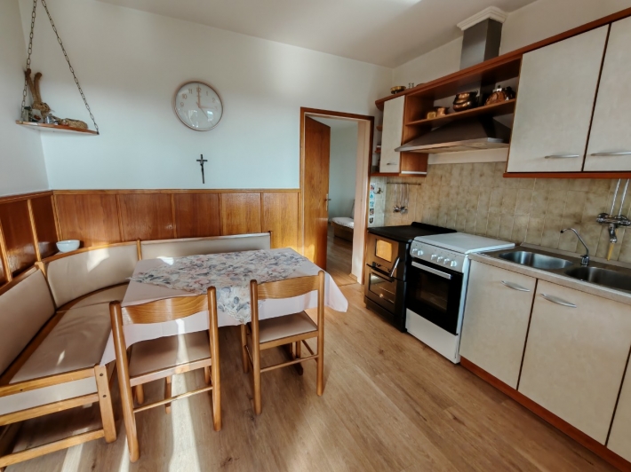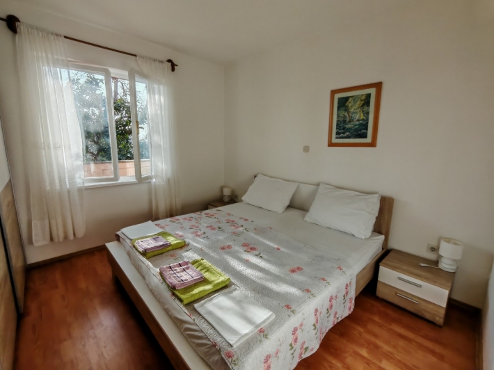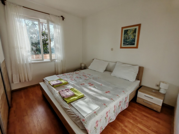 Description German: Diese Ferienwohnung für 4 bis 5 Personen befindet sich im Ort Banjol auf der Insel Rab. Die 70 qm grosse Unterkunft im Erdgeschoss des Hauses teilt sich in zwei Schlafzimmer, ein Badezimmmer so wie einen Ess-/Wohnbreich mit ausgestatteter Küche auf. Die überdachte Terrasse im Außenbereich lädt zum Verweilen ein. Der gemeinsame Grill befindet sich im Garten vor dem Haus. Der Badestrand im Autocamp PADOVA III ist nur 600m entfernt.